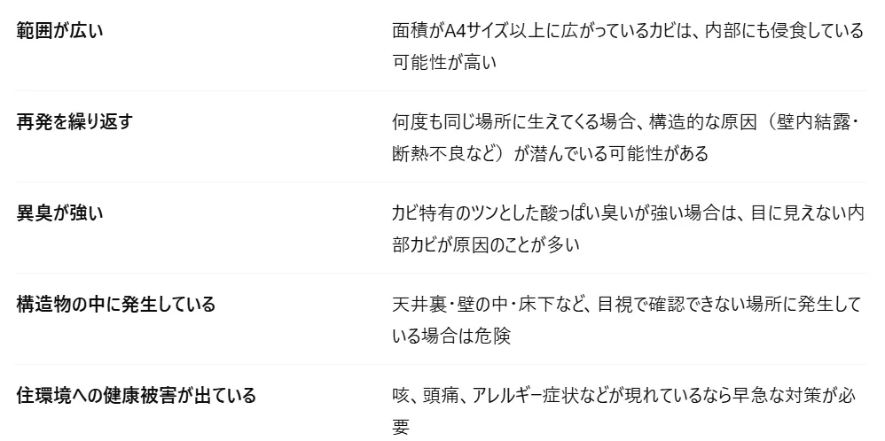 では、どんな場合に「これは重曹では無理、専門業者に依頼すべきだ」と判断すればよいのでしょうか?以下に、プロに任せたほうがいいカビの特徴をまとめます。