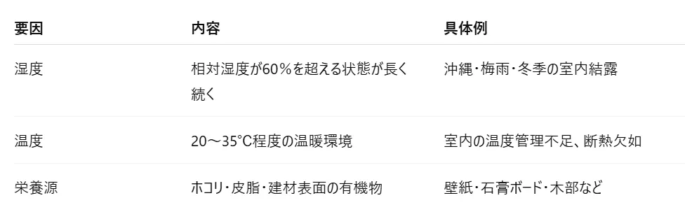 一般的に以下の3要素が揃うと、どんな住宅でもカビは発生します。