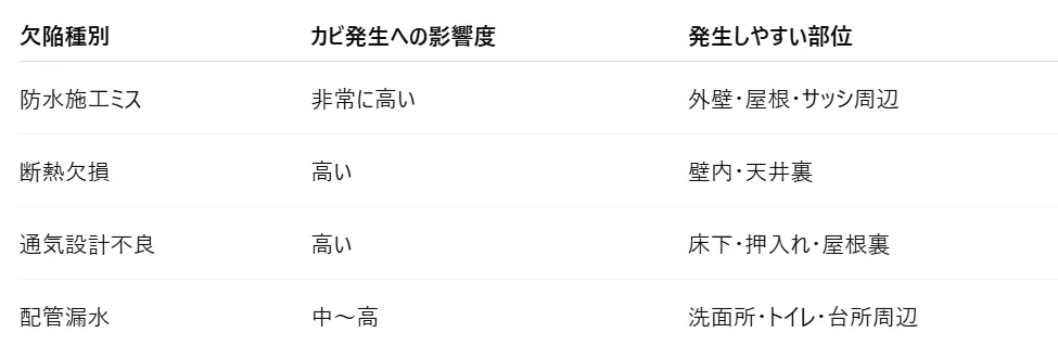 こうした日常要因が、欠陥と組み合わさることで、カビが爆発的に増殖します。