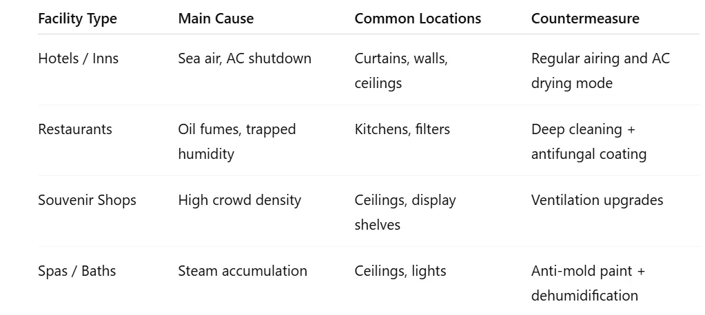 In Okinawa’s coastal hospitality industry, mold problems are aggravated by salt-laden sea air combined with persistent humidity.