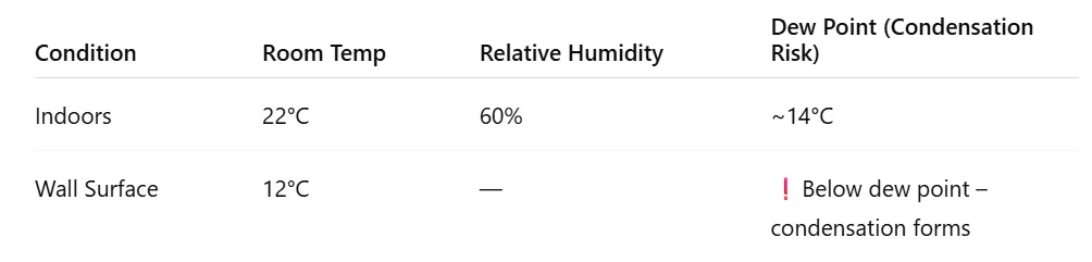 Once a wall or window surface drops below the dew point (around 14°C in this case), moisture starts forming on it. This trapped moisture becomes the perfect nutrient source for mold spores to grow. North-facing walls and window edges are particularly vulnerable.
