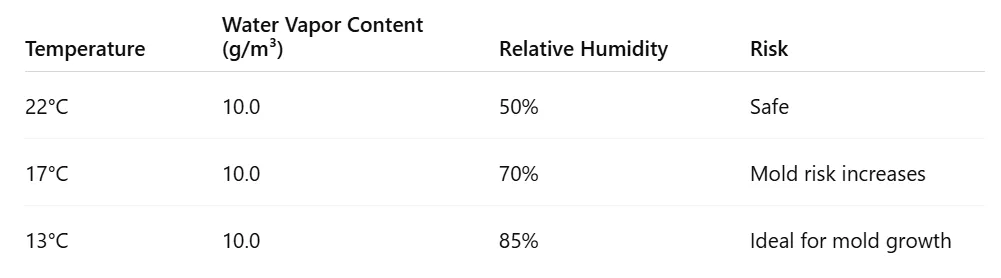 As temperature drops, the air can hold less moisture, bringing it closer to the dew point. When cold surfaces meet moist air, condensation occurs — creating the perfect microclimate for mold growth even in winter.