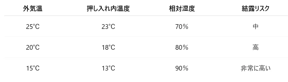 床下の湿度が高い場合、押し入れ内部の相対湿度も上昇し、梅雨時期や冬場の温度差によって結露を引き起こします。