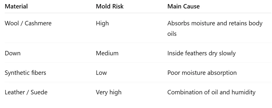 Many winter garments appear clean but still contain body oils and sweat that feed mold.