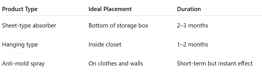 Since moisture accumulates at the bottom, place sheet-type dehumidifiers under stored clothes, and use hanging types inside closets.